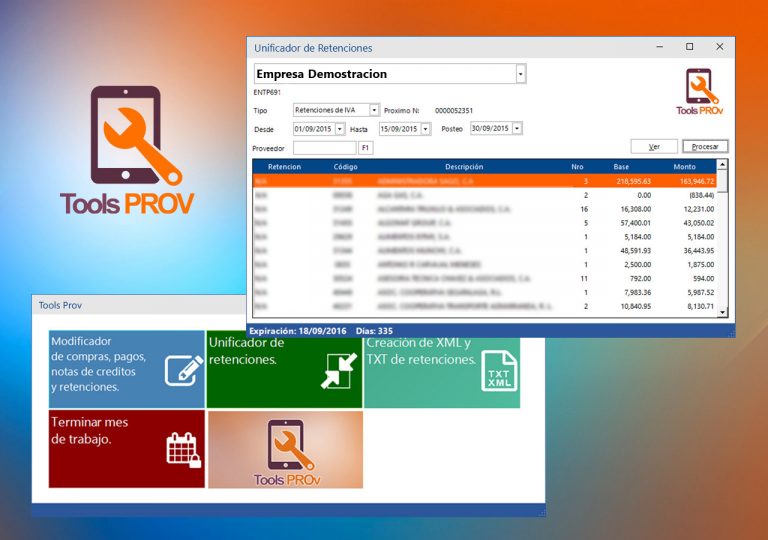 ToolsProv puede unificar las retenciones de IVA e ISLR generando un comprobante de retención por proveedor por periodo, crea archivos XML y TXT de las retenciones y ayuda a terminar el mes de trabajo a validar que las retenciones estén procesadas correctamente en formatos que puedan incluir el logo o firma digital.